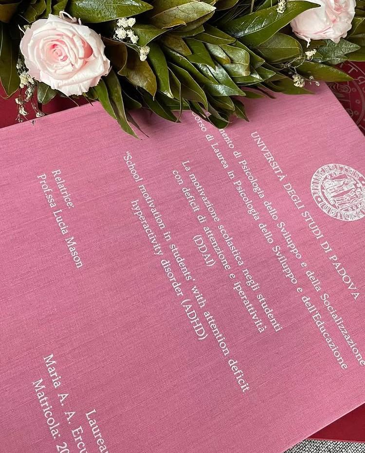 Nel 2024, sempre presso l’Università di Padova, ho conseguito la laurea magistrale abilitante alla professione in Psicologia dello sviluppo e dell’educazione, con una tesi bibliografica dal titolo “La motivazione scolastica negli studenti con Disturbo da Deficit di Attenzione e Iperattività”, relatrice prof.ssa Lucia Mason.